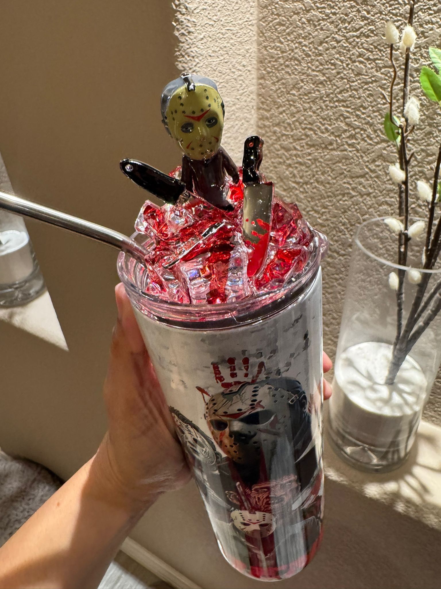 Iconic Horror Figure Topper: Features a detailed Jason Voorhees figure on the lid, adding a chilling 3D touch to this Halloween-themed tumbler.