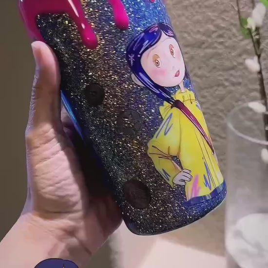 - Enchanting Glitter: A shimmering finish adds a magical touch, blending style with the delightful allure of this -Coraline themed tumbler.