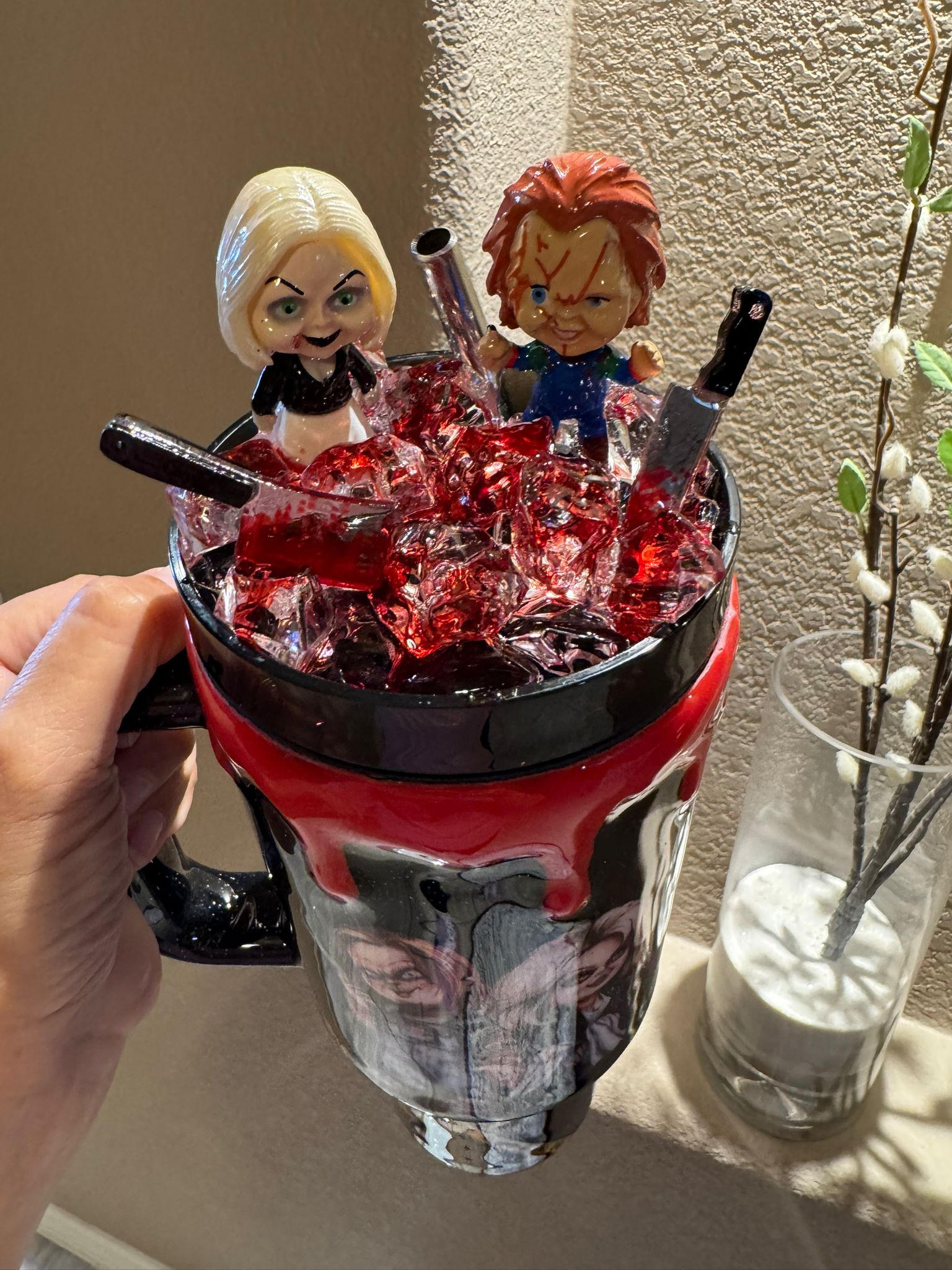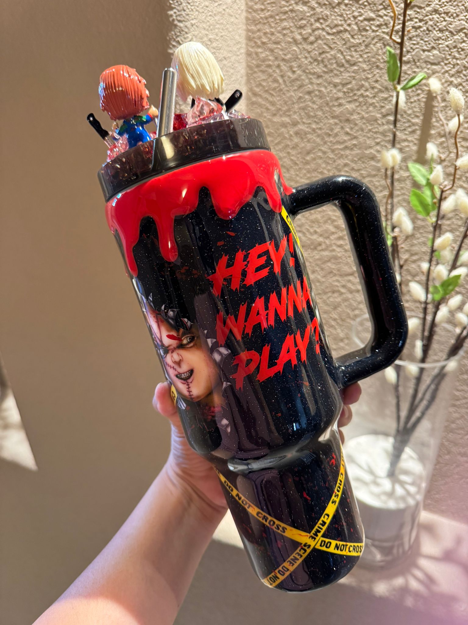 This 40 oz glitter tumbler, inspired by Chucky from Child’s Play and his girlfriend Tiffany Valentine, is perfect for horror fans. Crafted from durable stainless steel, its sparkling, eerie design blends style and function, keeping drinks hot or cold for hours. The lid features two detailed figures of Chucky and Tiffany, adding a chilling 3D touch to this horror-themed accessory.